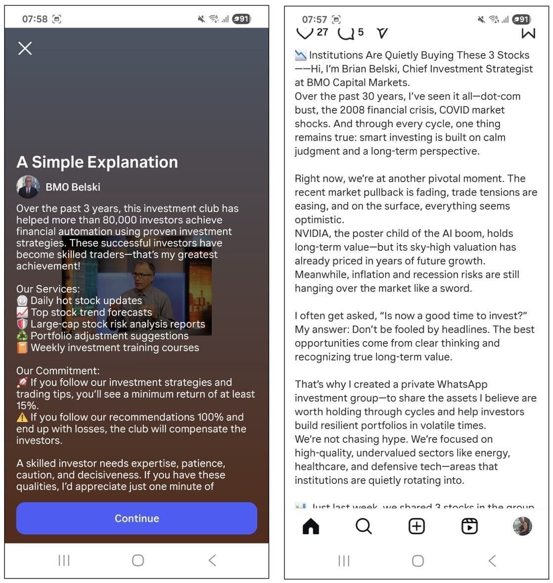 O que é mais preocupante é que instituições bancárias legítimas também produzem anúncios em diversas plataformas, tornando este tipo de golpe ainda mais plausível. O uso de deepfakes com pessoas famosas também passa maior credibilidade ao golpe. Em um destes casos, Brian Belski, líder do Investment Strategy Group e diretor do BMO é utilizado como rosto destes golpes, com vídeos gerados por inteligência artificial que podem induzir a vítima a clicar em um link, entrar em um grupo do WhatsApp ou compartilhar suas informações com atacantes.