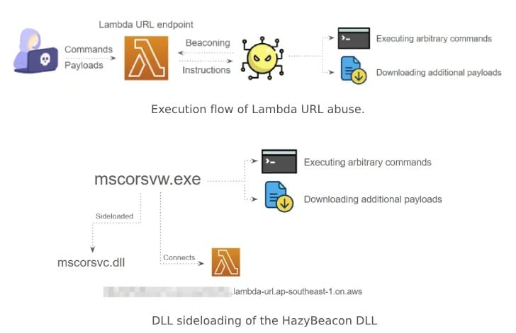 A atividade está sendo monitorada pela Unidade 42 da Palo Alto Networks sob o identificador CL-STA-1020, onde "CL" representa "cluster" e "STA" indica "motivação apoiada pelo Estado". O principal diferencial do HazyBeacon é o uso de URLs Lambda da Amazon Web Services (AWS) para fins de comando e controle (C2), ilustrando o contínuo abuso de serviços legítimos por agentes de ameaças com o intuito de evitar detecção. O grupo também faz uso de outros serviços populares, como Google Drive e Dropbox, como canais de exfiltração, disfarçando o tráfego malicioso como tráfego legítimo da rede.