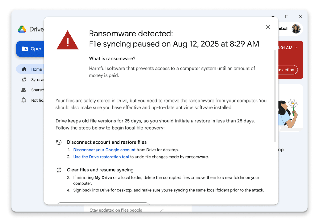 O Google anunciou na terça-feira uma nova camada de defesa para o aplicativo Google Drive para desktop, voltada para a detecção rápida de atividades de ransomware e para a interrupção da sincronização em nuvem antes que a infecção se espalhe.